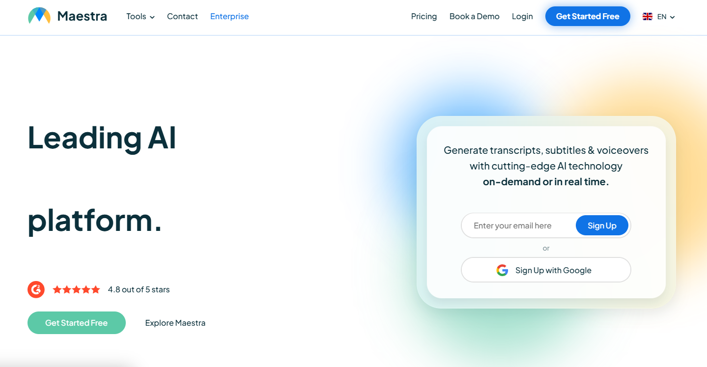 Maestra AI built its reputation on excellent post-production tools (transcription, subtitling, dubbing) and has recently launched “Maestra Live” to bring that same accuracy to real-time scenarios. It’s perfect for teams that need both live translation and high-quality post-event assets.
